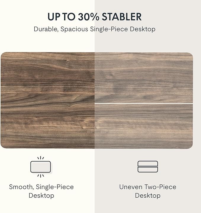 - AMPLE WHOLE-PIECE DESKTOP: With its whole-piece 1” eco-friendly desktop, this standing desk provides plenty of room for your computer setup, documents, and accessories, creating a well-organized and productive work environment. Due to hand measurements, desktop dimensions may vary slightly by 0 to 1”.
