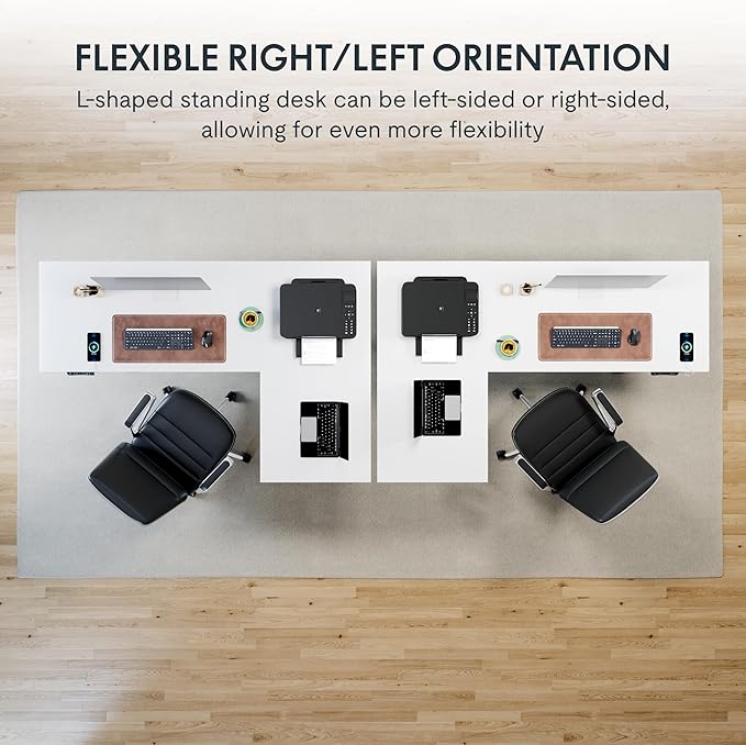- L Shape with 2 Part Top - Includes a spacious main desk and return desk, accommodating a variety of monitor and laptop setups along with important work materials, supplies, and decor. When fully assembled, the outside surface measures 71" x 48"