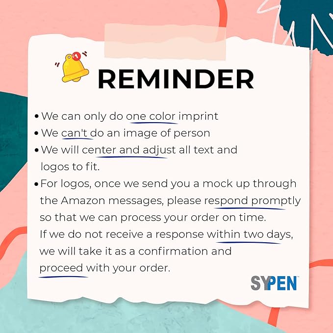 - Logo's: If you upload a logo at the "customize now" button, please look out for our message via the amazon messaging with a proof for approval. If we do not receive a response with approval or changes within two business days, we will proceed with the order according to the mock up we sent. Note: we do not send proofs for text only.