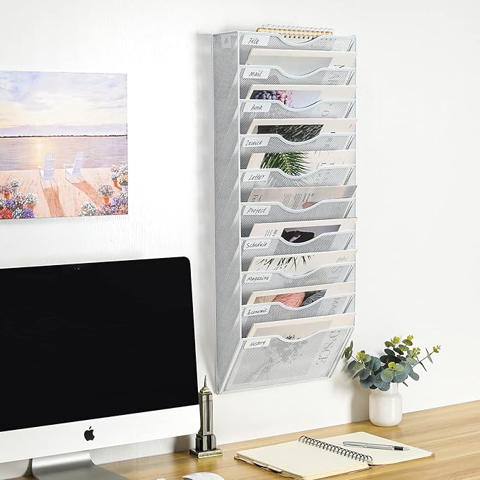 - ▶Multi Tier One-Piece Wall Organizer. The wall file organizer has 10 pockets, which has enough storage space to organize and store magazines, files, documents, A4 and letter size papers, mails, bills, letters, catalogs and more