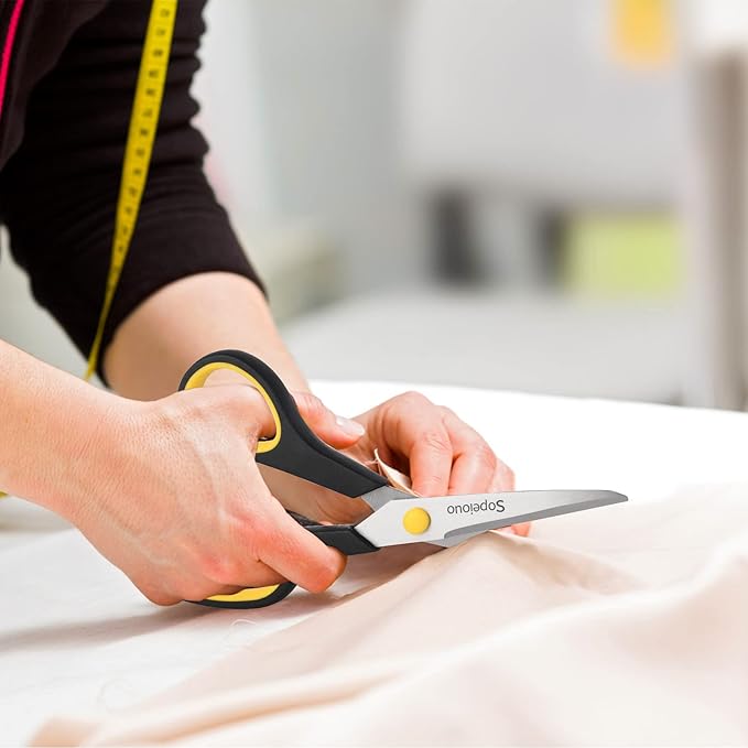 - All Purpose Scissors -- Heavy duty scissors, great for most regular household tasks, such cutting through paper, thin cardboard, poster board, light ribbon, tape, photos, light fabric, card stock, medium plastic, foam, foil, burlap, canvas,Perfect for sewing, tailoring, quilting, dressmaking, cutting patterns, alterations, hand craft
