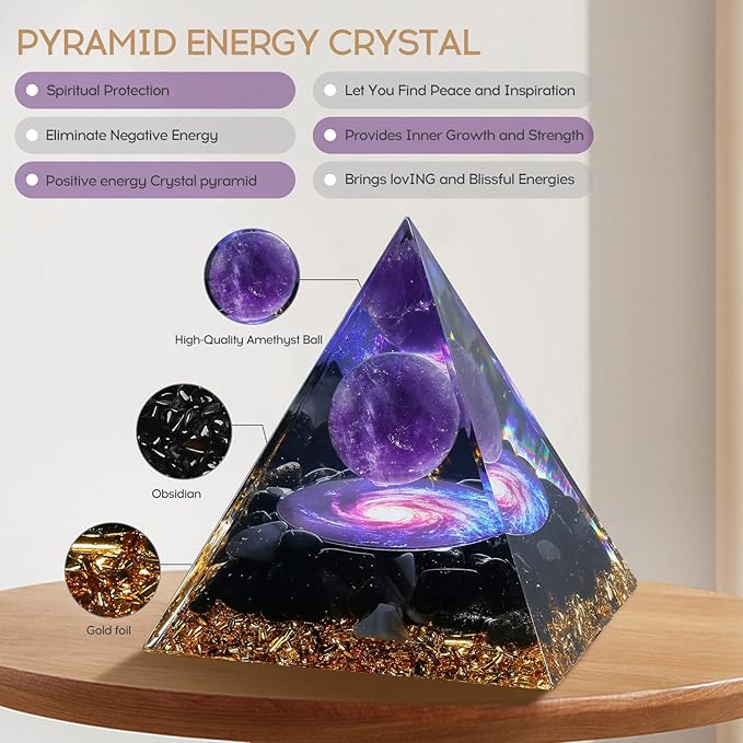 - 🌱【Healing Crystal Pyramid】: Orgone Pyramid is made of natural amethyst ball, Obsidian, gold leaf, natural resin. High-quality amethyst nourishes the nervous system, stimulates the brain and stimulates creativity. Obsidian can absorb negative energy and release positive energy, reduce stress, purify your inner mind, and relax your body.