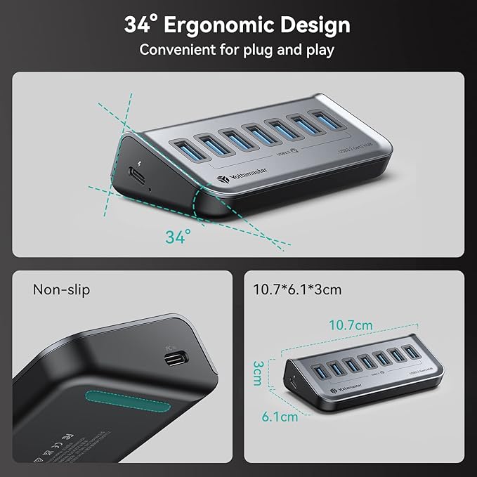- 【Ergonomic Design】This USB hub 3.0 offers superior protection, excellent heat dissipation and a sleek look. The ergonomic 34 degree angle makes unplugging and plugging in USB devices hassle-free and comes with a non-slip strap for extra stability on the desktop.