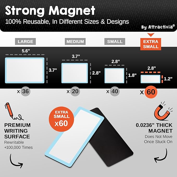 - Premium Quality: Our magnetic labels for whiteboard feature a white, dry erasable front, ensuring smooth writing and easy wiping. No more ghosting, streaks, or dull markings. Every message stays clear and professional with our magnetic labels for shelving. Each label measures 2.8 x 1.2 inches.