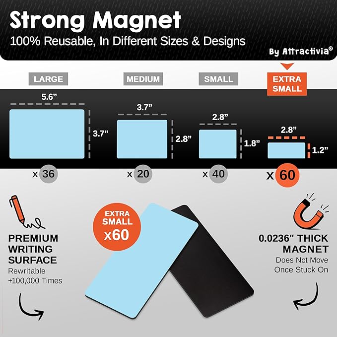 - Strong Magnetic Hold: Our dry erase magnets feature a powerful 0.02 inch thick magnetic back for instant and secure adhesion to any metallic surface, whether flat or slightly curved. Easily attach our dry erase stickers labels and remove without residue, ensuring a firm grip even on rounded surfaces.