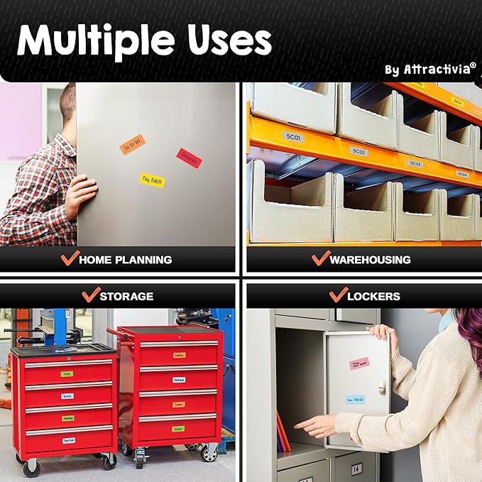 - Premium Quality: Our magnetic labels for whiteboard feature a white, dry erasable front, ensuring smooth writing and easy wiping. No more ghosting, streaks, or dull markings. Every message stays clear and professional with our magnetic labels for shelving. Each label measures 2.8 x 1.2 inches.