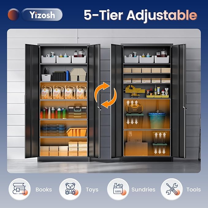 - 『PRACTICAL DESIGN』:Our tall metal cabinet equipped with lock and 5 adjustable shelves to provide adaptability and convenience. High-grade lock picking to secure valuables, two keys are included. Regardless of what your storage needs are, you have the ability to create a unique storage space to suit them.