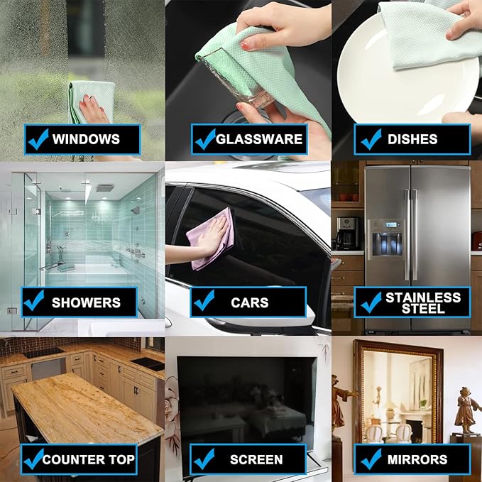 - Streak-free lint-free: Microfiber Glass Scrubbing cloth are best for cleaning & polishing glass windows mirrors car windshield dishes wine glassware bath shower door and stainless steel,eyeglass lens,Computre. Unique fish scale wave can catch dust dirt easily remove smudges water spots fingerprints fast. Easyclean lintfree rag.
