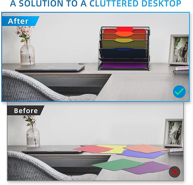 - [Easy to Store & Clean] The grooves on the 6 trays of office organizer is facilitate for a easy picking and placing of items. Also, the hollow design on both sides of the desktop file organizer, is not only convenient for cleaning, but also super easy for movement of the organizer.
