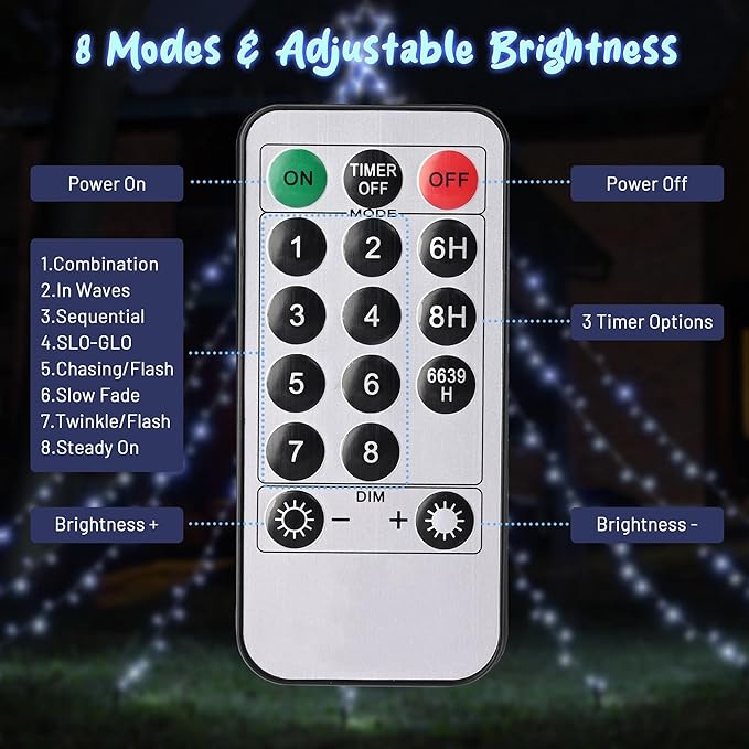 - [8 Modes & Adjustable Brightness]: Press button to switch modes of lighting: Combination, In Waves, Sequential, Slo-glo, Chasing, Slow Fade, Twinkle and Steady on, freely choose the mode to make different effects for various occasions; 4 brightness levels & 3 timers to select according to your need