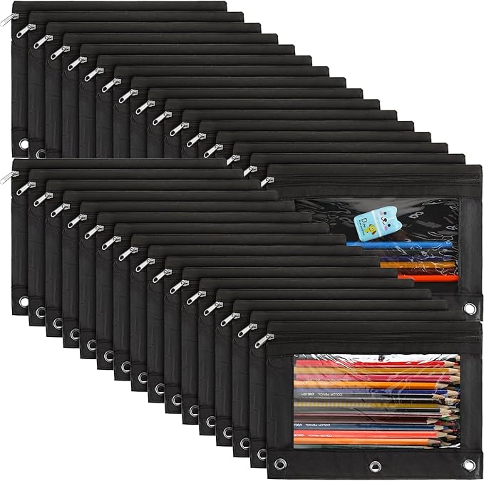 Marspark 30 Packs Pencil Pouch 3 Ring Binder Pen Pouch Cloth Pencil Pouches Zipper Pen Case Bag with Clear Window for School Office Writing Supplies Gifts(Black)