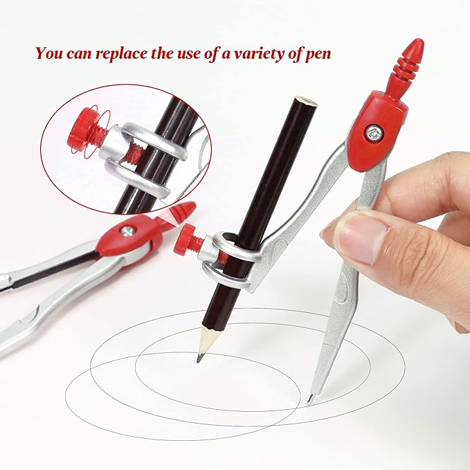 - A Practical Compass Geometry Set: Metal compasses will not bend, Ergonomically designed compass head is comfortable to hold, Universal Holder Compass work with any standard sized pencil or pen