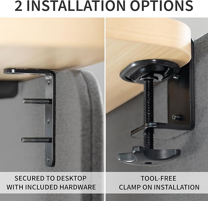 - Sturdy Desk Clamps: Clamp this panel to your desk (0.4” to 1.4” in thickness) for a secure, yet flexible setup. The clamps are easy to install for convenient placement, and spacers are included to allow room for cable routing and monitor mounts