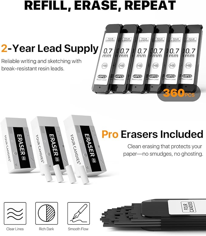 Four Candies Metal Mechanical Pencil Set - 3PCS 0.7mm Art Mechanical Pencils & 360PCS HB Lead Refills & 3PCS Erasers & 9PCS Eraser Refills, Drawing Mechanical Pencils for Writing, Sketching-With Case