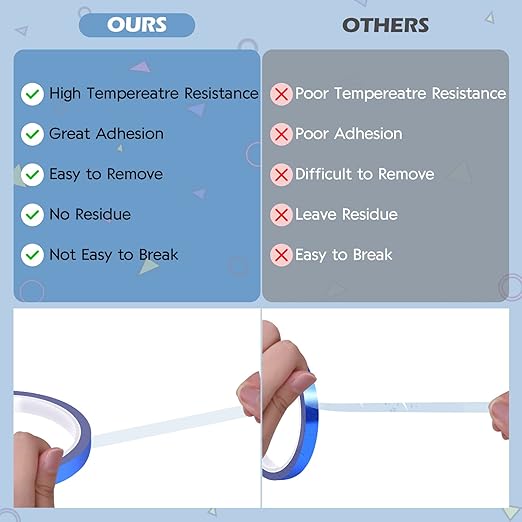 - 【High Temperature Resistance】:Blue heat resistant tape is made of PET material, heat tape for sublimation is compatible in a wide temperature range of -30°C (-22°F) to 200°C (392°F). Long period heat resistance 220℃(428°F), short period heat resistance 250℃(482°F). Heat transfer tape is very good at protecting the surface of the product during painting, welding, ironing, etc., no need to worry about it melting