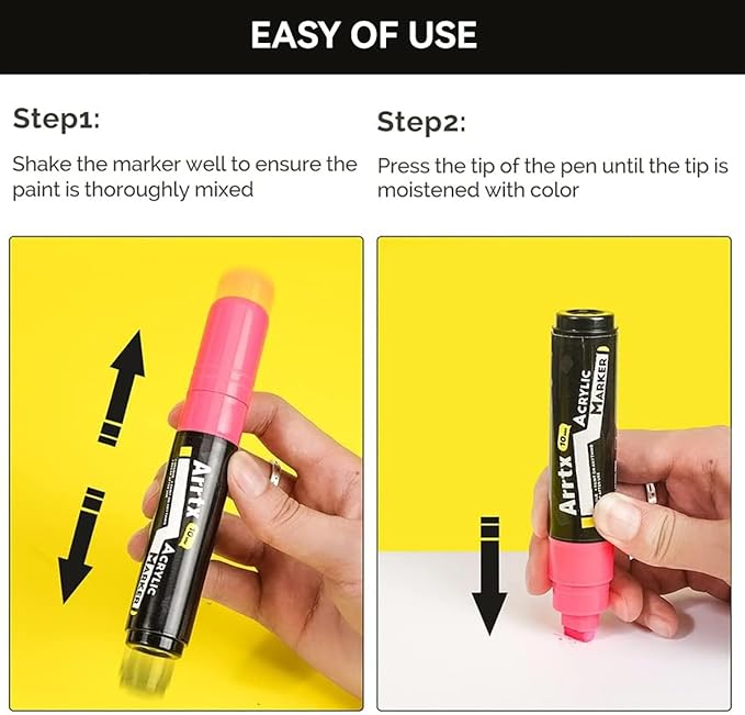 - [Shake Well Before Use] Arrtx acrylic paint pens only require you to shake them and then press down the nib on some paper or card until you see the paint come down