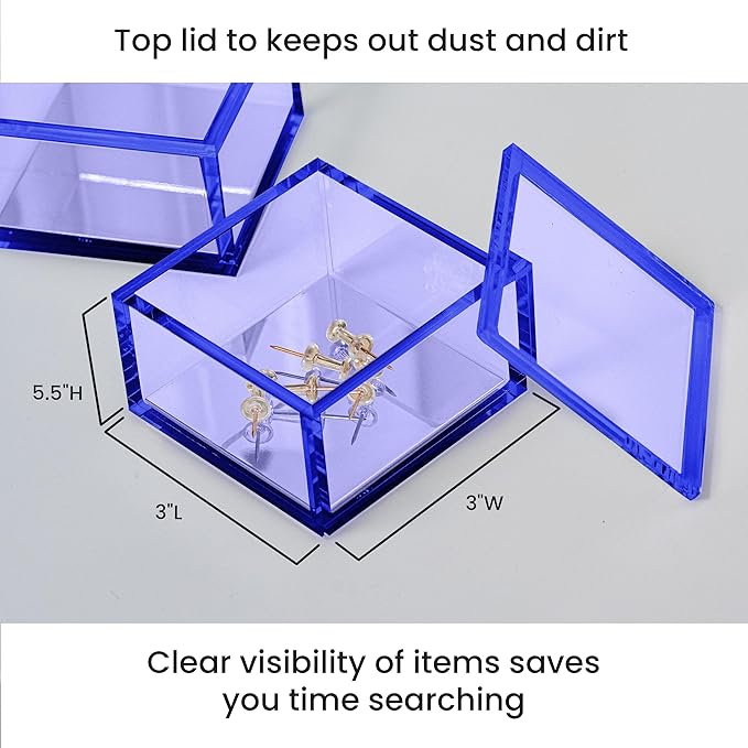 - Size and shape - This square-shaped small desk organizer measures 3” L x 3" W x 5.5 H and boasts a sturdy silver metal base. The clear organizer box features a transparent blue color, adding a clean organized look to any desk or tabletop.