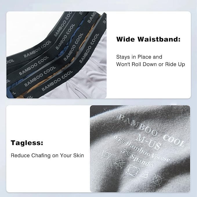 • PREMIUM MATERIAL: 92% Viscose Made From Bamboo and 8% Spandex,light and soft texture.It is 30% more breathable than cotton underwear and the average body temperature is 3°lower than cotton ones,bringing a fresh touch to your skin