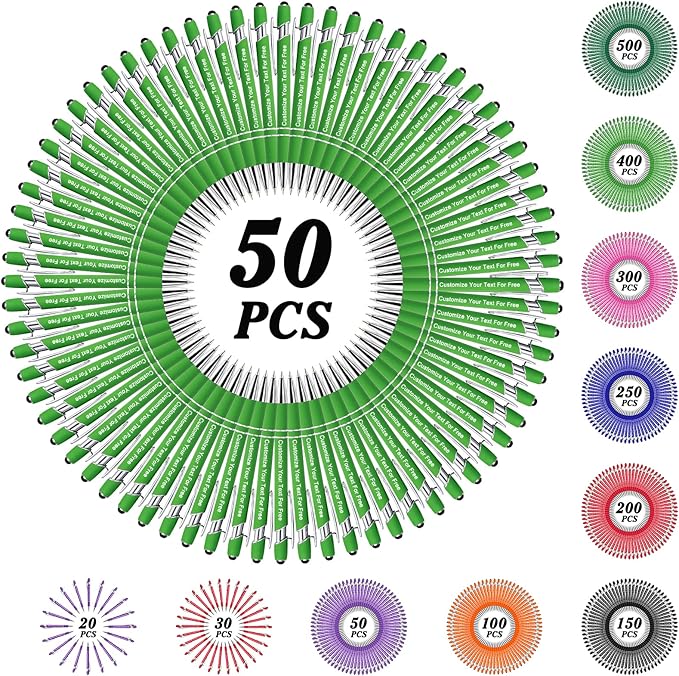- ā Custom Pens Bulk: We provide 50+/100+/150+/250+/300+/400+/500 pcs pens for you to customize. You can leave any text you need on the pen, and we will engrave it perfectly on each pen. These multi-colored pens with perfect craftsmanship will be the best choice for parties, conferences, trades, companies, churches, etc.