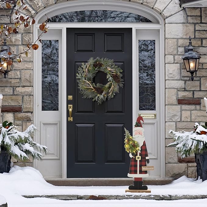 - UNIQUE RUSTIC DESIGN: This Santa porch sign in a red and black plaid coat will greet friends and festival. Christmas tree decorates with berry needles and pine cones in right hand and WELCOME sign in left hand. Red hat decorates with retro bells echoing pine cones. Flashing LED lights are still cheerful and bright at night. 9 bulbs with warm white light, 2AA batteries are needed. It's a perfect accent to place outside and near an entryway door.