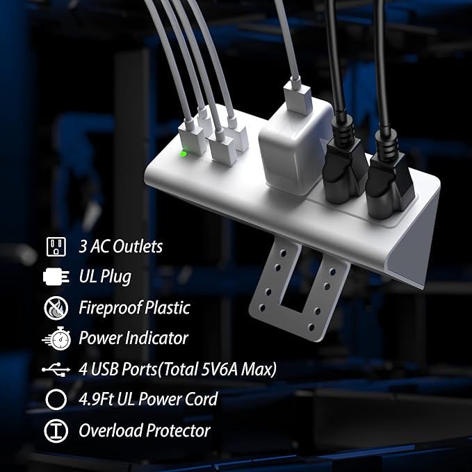 - [7-in-1 Desk Clamp Power Strip] 3 Standard AC outlets with wide space between them make you can supply for more appliance at the same time. The UL power cord was made of pure copper core and multi protection systems provide device safety from over-load and short circuiting.
