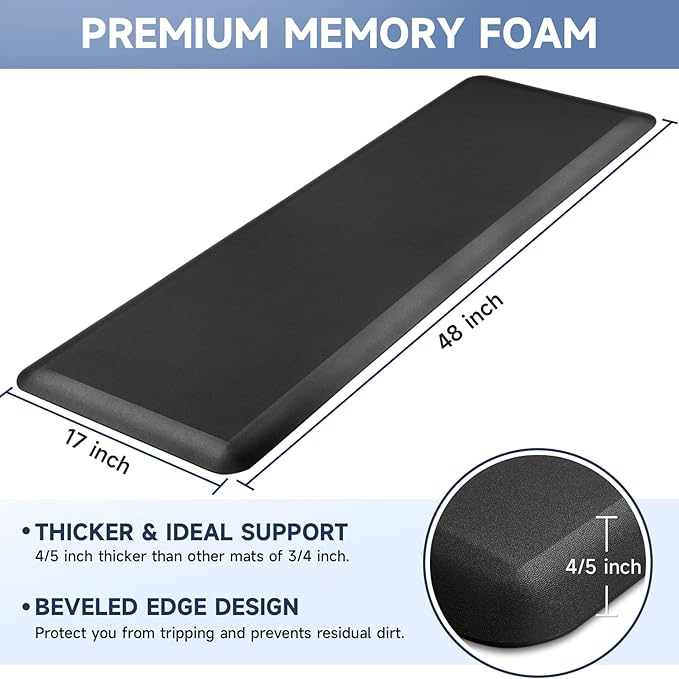 - 【Thicker Mat】The StepRite kitchen mat is made of 4/5 inch thick memory foam for better support and comfort when standing. Measured as 17*47 inches. Suitable for kitchen, office, laundry room or any high-traffic area.