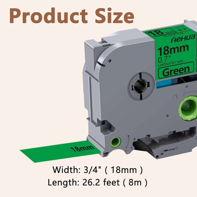- Size - 3/4" ( 18mm ) x 26.2' ( 8m ) each 18mm label tape. Color - Black letter on green tape