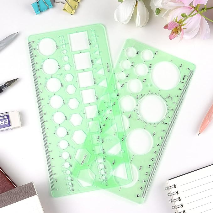 - 2 pack shapes drawing templates can paint geometric patterns like different sizes of circle, which are handy drawing helpers.