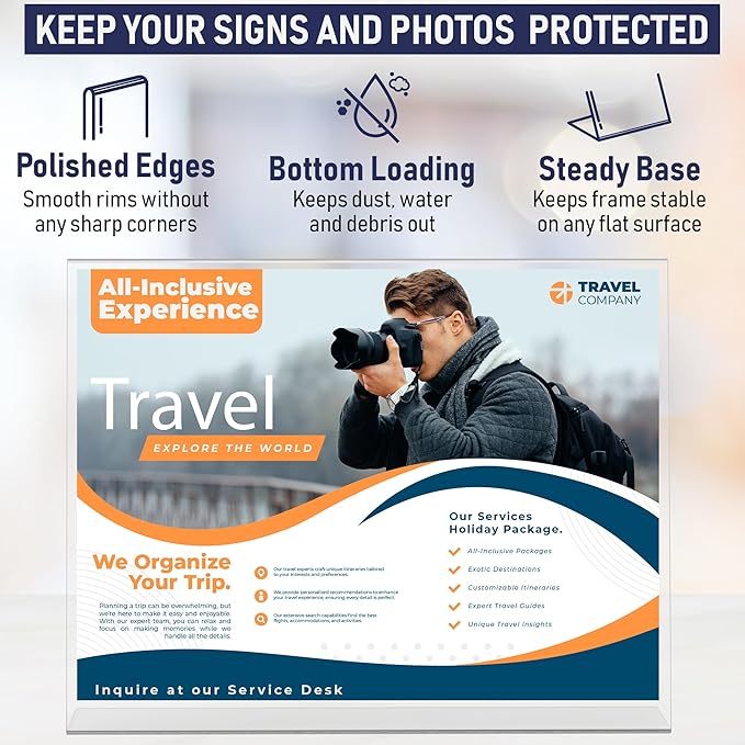 - Compact and Portable: With a sleek yet portable design, this acrylic sign holder takes up minimal space, making it ideal for tabletops or counters. Enjoy the convenience it provides, keeping your displays attractive, organized, and accessible wherever you go. Plus, itβs free of stubborn plastic film, offering crystal-clear visibility from the moment you unbox it, making it perfect for standing displays at events or any occasion