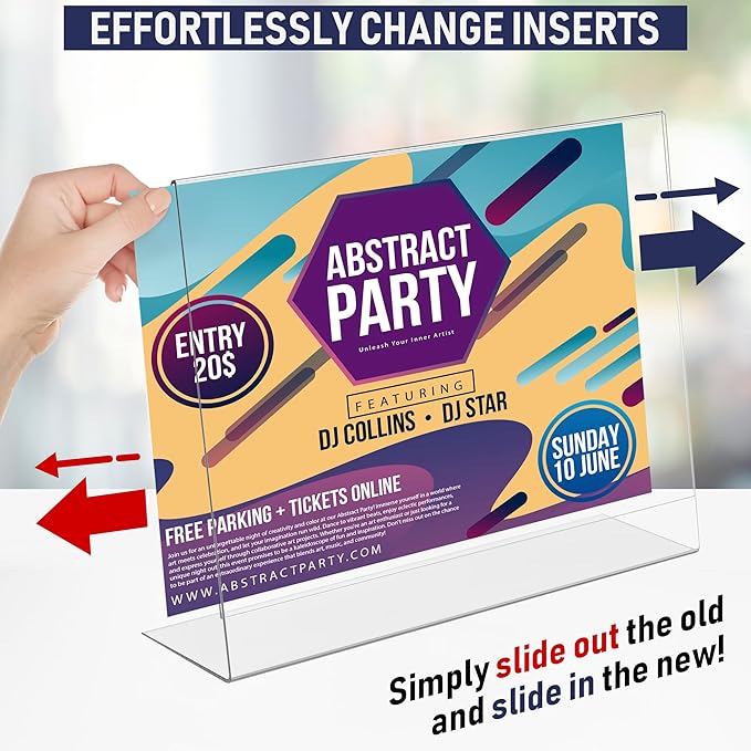 - Effortlessly Change Inserts: The 11 x 8.5 Slant Back Acrylic Sign Holder makes it simple to update your displays. With its easy side-loading design, you can quickly insert materials that fit snugly. Whether you're swapping out inserts, event signs, or important notices, this holder keeps the process fast and stress-free. Its straightforward design saves you time and effort, making it an ideal solution for those who need to change content frequently with ease