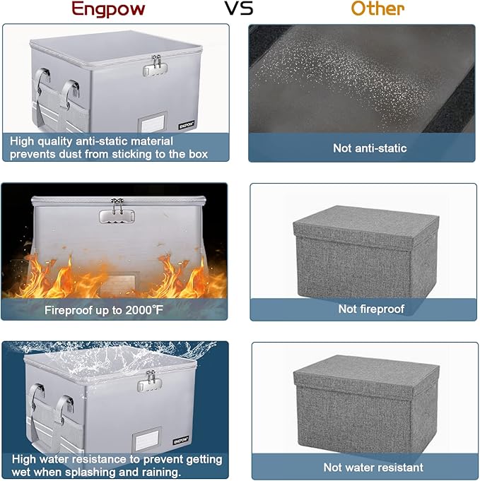 - Fireproof and water-resistant: Fireproof lock box is made of double layered non-itchy silicone coated fiberglass which stands up the temperature up to 2000℉.It has been passed by SGS TEST(UL94 VTM-0 Certified).Fireproof file box is not only fireproof but also high water resistant in case it gets wet for any reason.Nothing is completely foolproof, but added protection is always a good idea.