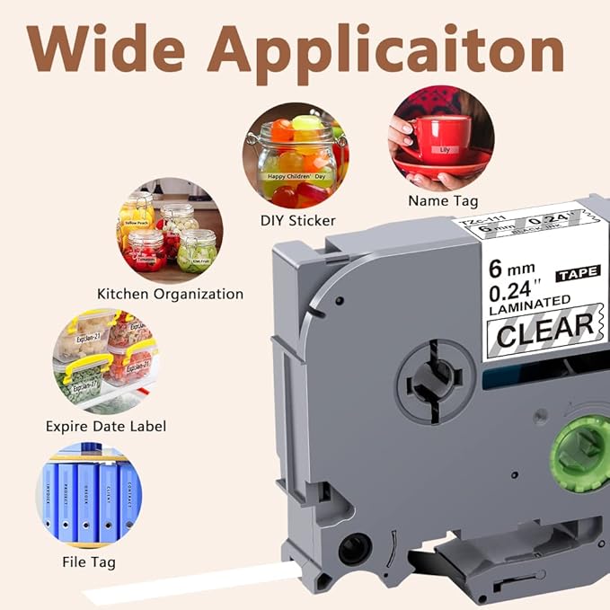 - Wide application: Compatible for Brother P-touch TZe 111 label tape is ideal to print clear, good-looking and durable labels. These labels are great for shelving, kitchen use, cabinets, file folders, USB sticks, food containers, storage boxes, personal possessions, children's school equipment with it's superior adhesive