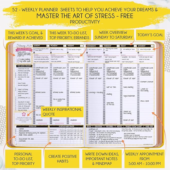 - WEEKLY & DAILY PRODUCTIVITY SYSTEM – Boost focus and happiness with this 2026 weekly planner that also works as a 2026 daily planner, goal planner, gratitude journal, and to-do list organizer. Based on the Law of Attraction framework, this 2026 planner weekly and monthly helps align your goals with actions for success.