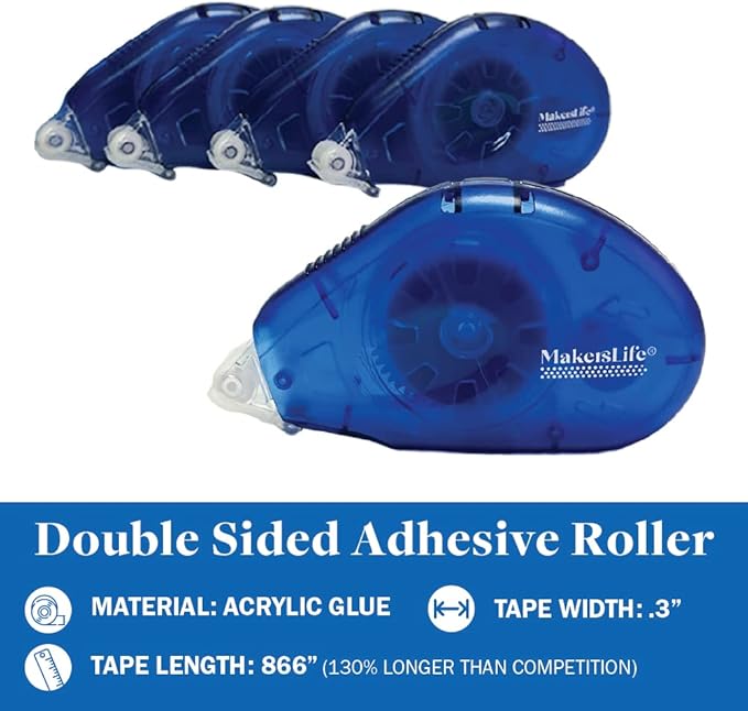 - EXTRA LONG: Each double sided tape dispenser has more than 72' (866") of double sided craft tape DOTS. A perfect line of crafters tape. Is smooth and easy to apply even in sharp turns. Adhesive roller