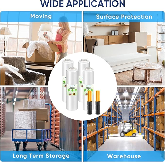 - [WIDE APPLICATION] Our moving wrapping plastic roll is perfect for homeowners and small shop owners. It can wrap moving boxes, TV, cover furniture to protect its surface, wrap travel luggage, and wrap pallets. You may find much more great use beyond these. The stretch wrap rolls are essential packing supplies for moving