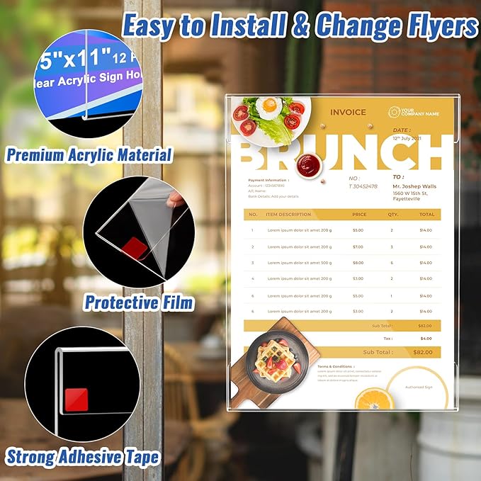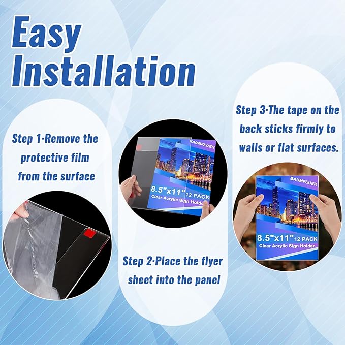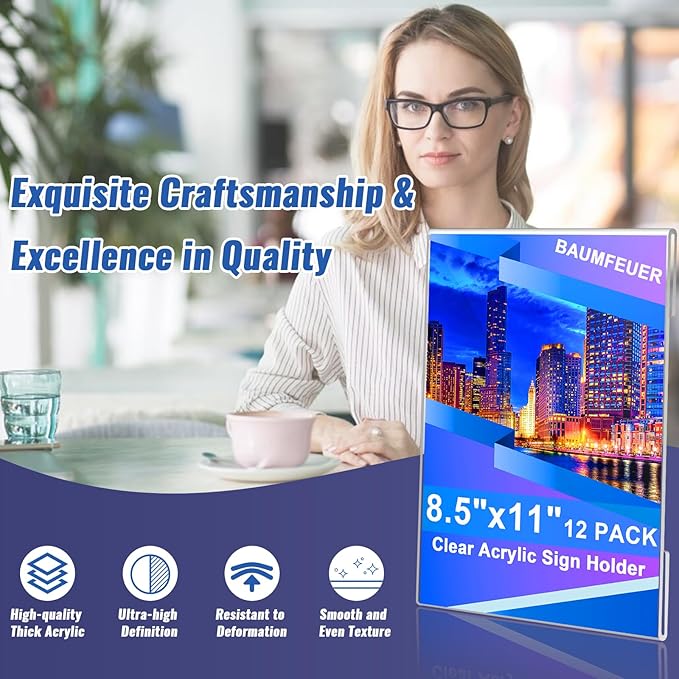 - It includes 12 Packs of 8.5 x 11 inches acrylic sign holders with adhesive pads. The sign holders are thickened and 0.6 inches thick, which makes them more durable.
