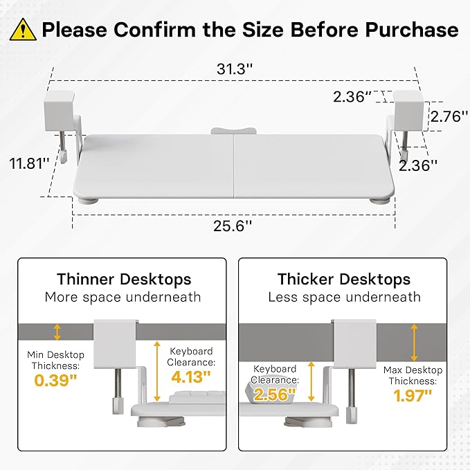 - ❗️ CHECK DESK COMPATIBILITY BEFORE PURCHASE – This under-desk keyboard tray won’t work with desks that have curved, beveled, or rounded edges, or crossbars/support beams underneath. Please check the product images to ensure your desk has a flat, unobstructed underside for clamp installation