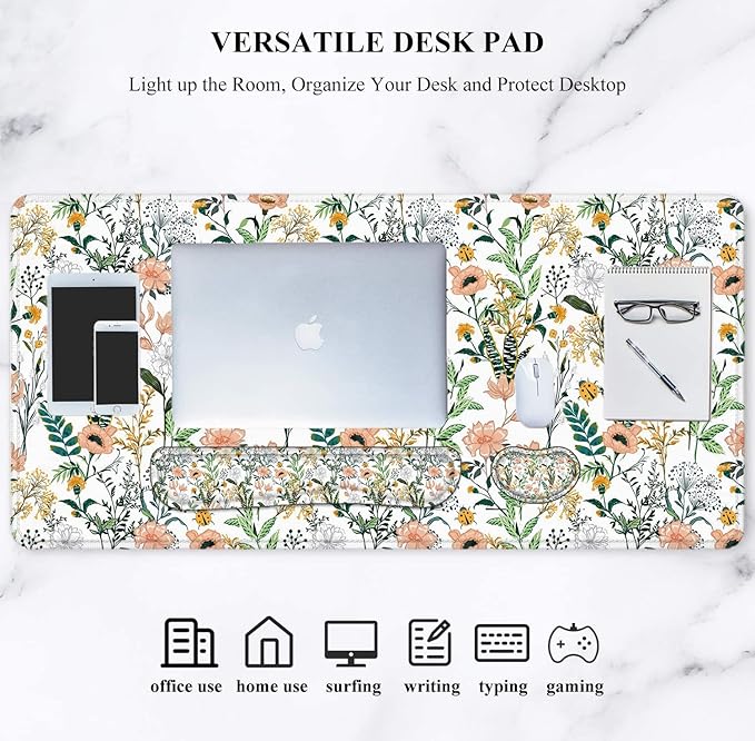 - 【4-in-1 Mouse Pad Set】Our large mouse pad and wrist rest set includes desk pad (35.4x15.7inch), keyboard wrist rest(16.9x3.5inch), mouse wrist rest(5.5x3.1inch), cup coaster(3.5x3.5inch). No need to buy separately, at a super cost-effective price. This desk pad for keyboard and mouse is large enough to fit your mouse, gaming keyboard, and other desk items. Our desk pad protector can keep a clean, uncluttered desk. This helps to improve the gaming experience or work efficiency in the office.