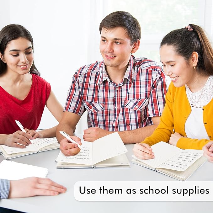 - Feela 24 Pack Classic Ruled Notebooks contains 24 white ruled sturdy cover notebooks and 24 Black Retractable Pens. Each of the notebooks measures 8.3” x 5.1”, which is perfect to carry and easily held by young girls and boys. These black cute pens are customized to be placed in the pen holder, which is pretty convenient.