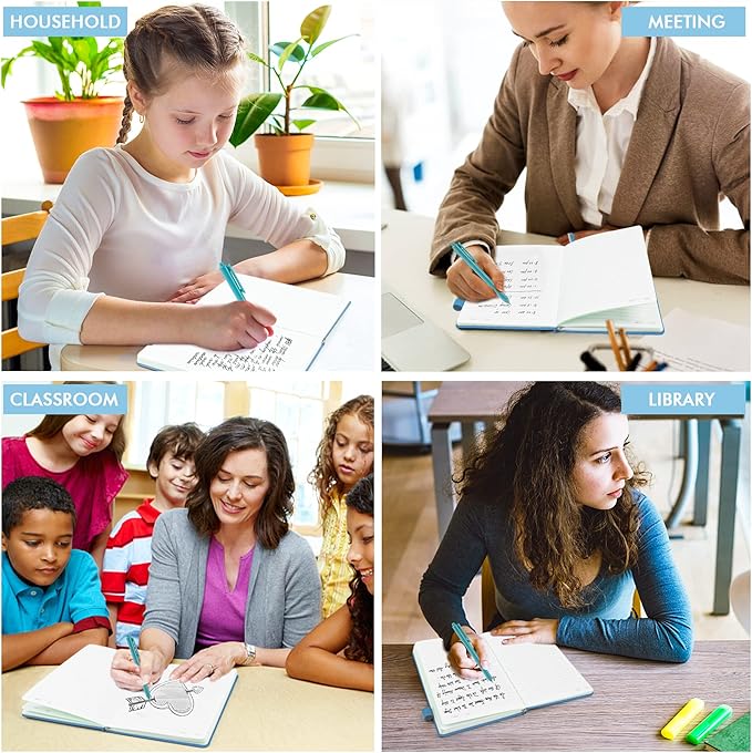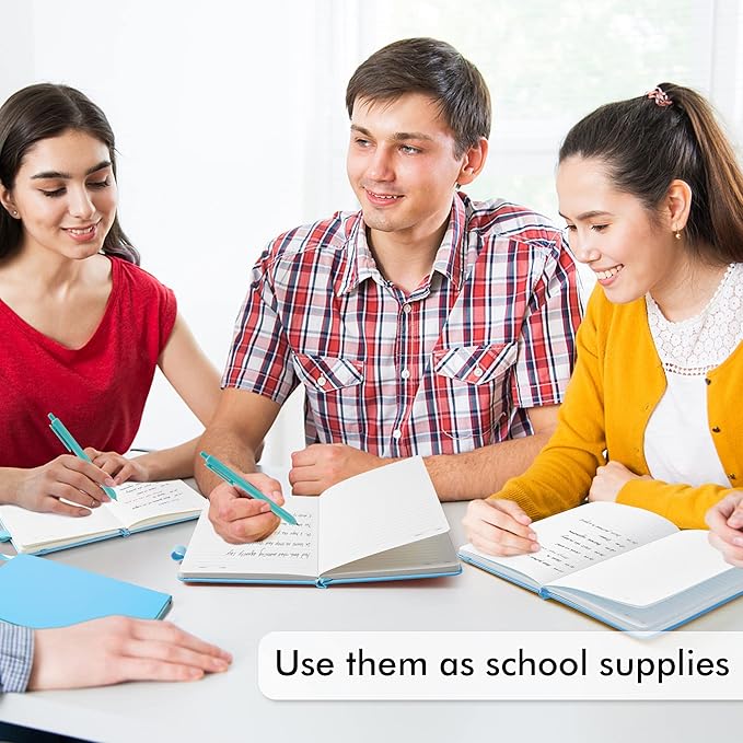 - Feela 5 Pack Classic Ruled Notebooks contains 5 Blue ruled sturdy cover notebooks and 5 Black Retractable Pens. Each of the notebooks measures 8.3” x 5.1”, which is perfect to carry and easily held in hand. These black cute pens are customized to be placed in the pen holder, which is pretty convenient.
