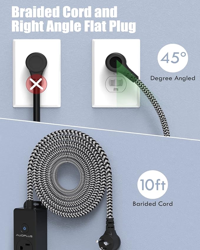 - 10FT Power Cord & Flat Plug: Equipped with a right-angle flat plug for fitting in tight spaces, perfect for your nightstand. With a 10ft power strip long cord, it's perfect for home, office, or dorm. The braided power cord is not easy to deform, is durable, and is safer than other power cords.