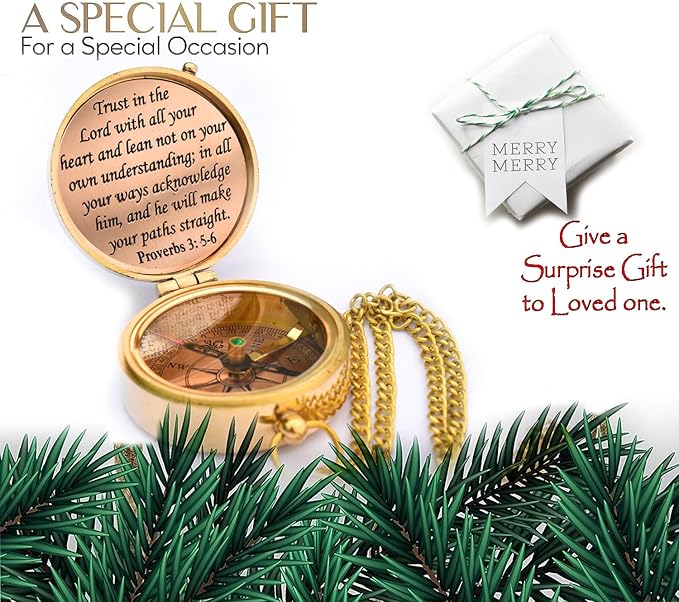 - Solid Brass Compass Antiquated Brass Finish With Trust in The Lord with All Your Heart -Proverbs 3: 5-6 Quote Engraved Compass with Wooden Box