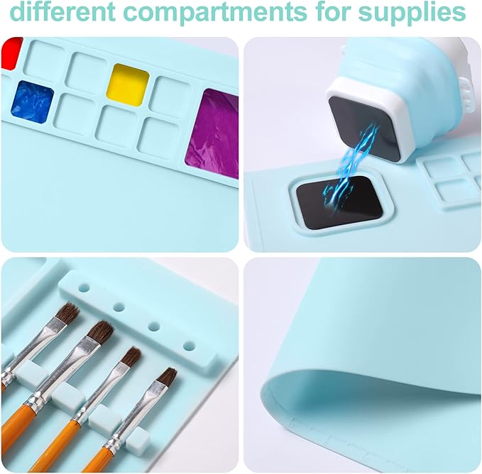- [UNIQUE DESIGN] - Silicone painting mat has a collapsible attached cup with brush holders on the side and top, built-in paint wells, and brush rests. Keep clean while creating efficiently.