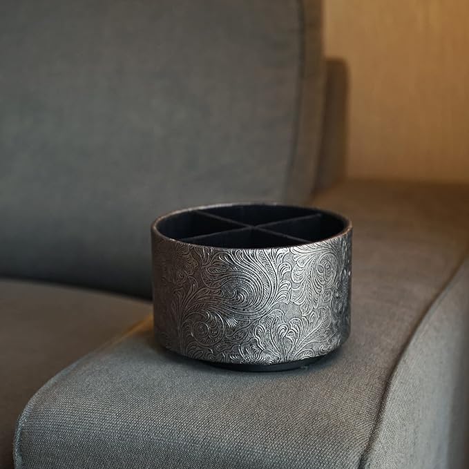 lizimandu Round Leather Art Supply Organizer,Remote Control Holder,360 Degree Spinning,Multi-Functional Pencil Holder,4 Compartments Desktop Stationary Organizer(1-Grey)