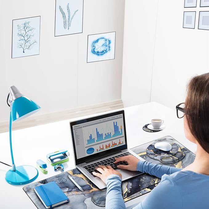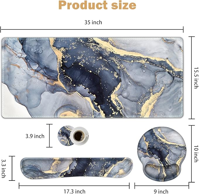 - 【4-in-1 Mouse Pad Set】Ergonomic mouse pad includes desk pad (35x15.5inch), keyboard wrist rest(17.3x3.3inch), mouse pad wrist rest(9x10inch), cup coaster(3.9x3.9inch).No need to buy separately, at a super cost-effective price. This desk pad for keyboard and mouse, is large enough to fit your mouse, gaming keyboard, and other desk items. Keep a clean, uncluttered desk. This helps to improve the gaming experience or work efficiency in the office.
