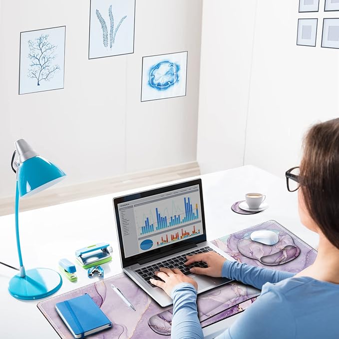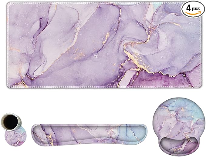 ARTSO Large Mouse Pad Ergonomic Keyboard Wrist Rest Support Set, Memory Foam Gel Wrist Pad, Extended Desk Mat Protector, Non-Slip Desk Blotter, Purple Blue Marble