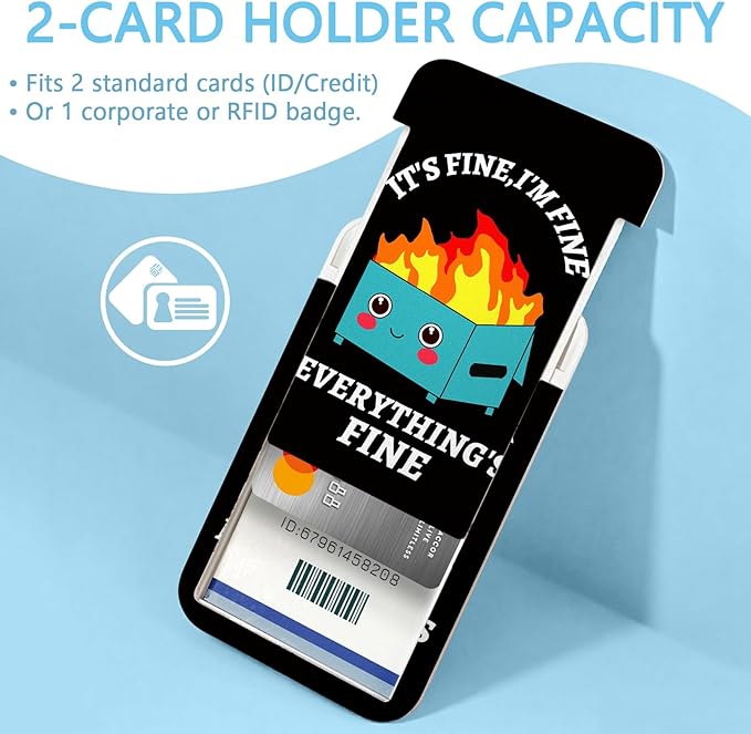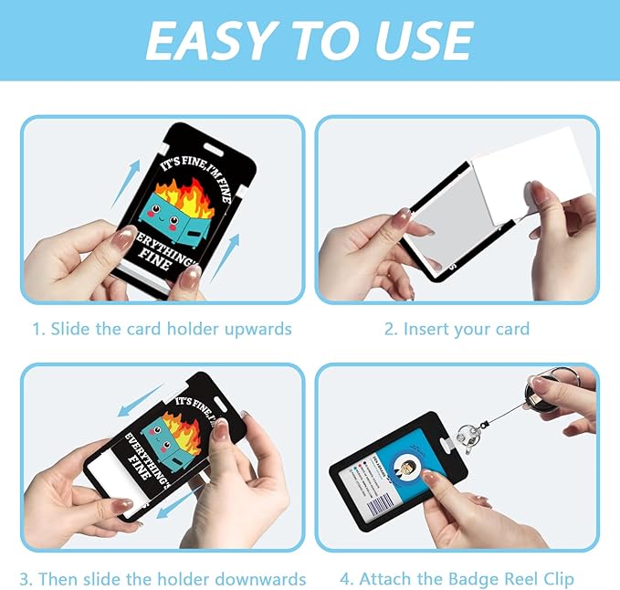 - Novelty Badge Holder: This cute blue dumpster badge reel is designed with funny arts: I'm Fine It`s Fine Everything is Fine. The cute and interesting badge reel will always bring more happiness and fun to your life. The set includes a detachable lanyard, heavy duty badge reel, and card holder, great for personalizing your work accessories