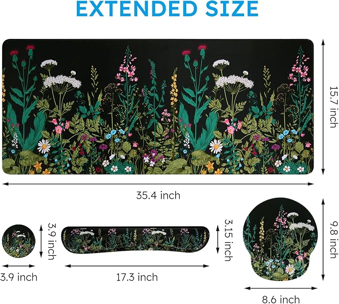 - Large Mouse Pad Size: Extended mouse pad:35.4" x 15.7",wrist rest for computer keyboard:17.32" x 3.15" x 0.98",wrist rest for mouse:8.66" x 9.84" x 0.86",Coaster:3.93" x 3.93"