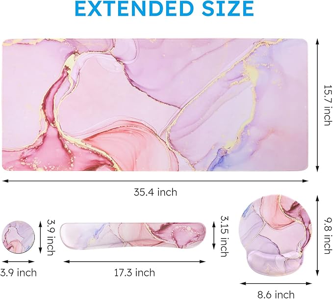 - Large Mouse Pad Size: Extended mouse pad:35.4" x 15.7",wrist rest for computer keyboard:17.32" x 3.15" x 0.98",wrist rest for mouse:8.66" x 9.84" x 0.86",Coaster:3.93" x 3.93"
