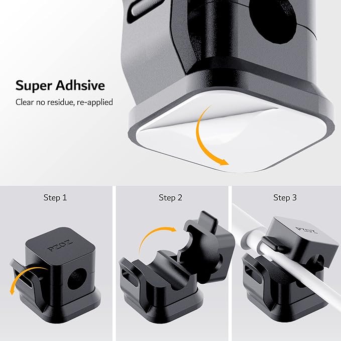 - 【No-Residue Adhesive】This cable organizer comes with a strong adhesive tape that can tightly adhere to any clean smooth surfaces. Adhered easily to desk, glass, metal, ceramic tile and other smooth surfaces. Clear the removable stickers will not damage surfaces. 【TIPS】When Sticking, keep pressing for 1-2 minutes to enhance the adhesion of the sticky pad. Please wait 12-24 hours before using.